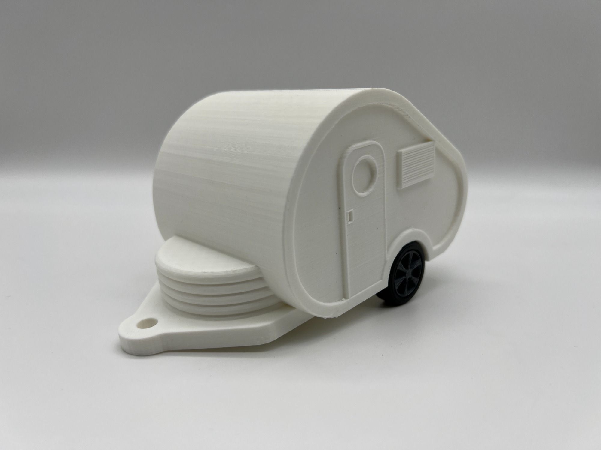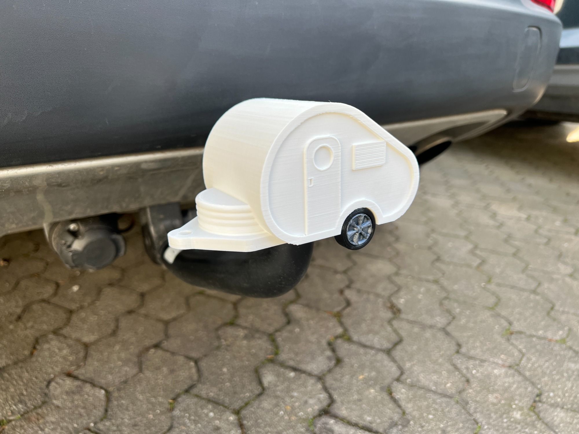 Eine Schutzkappe in Form eines Wohnwagens für den Kugelkopf der Anhängerkupplung.