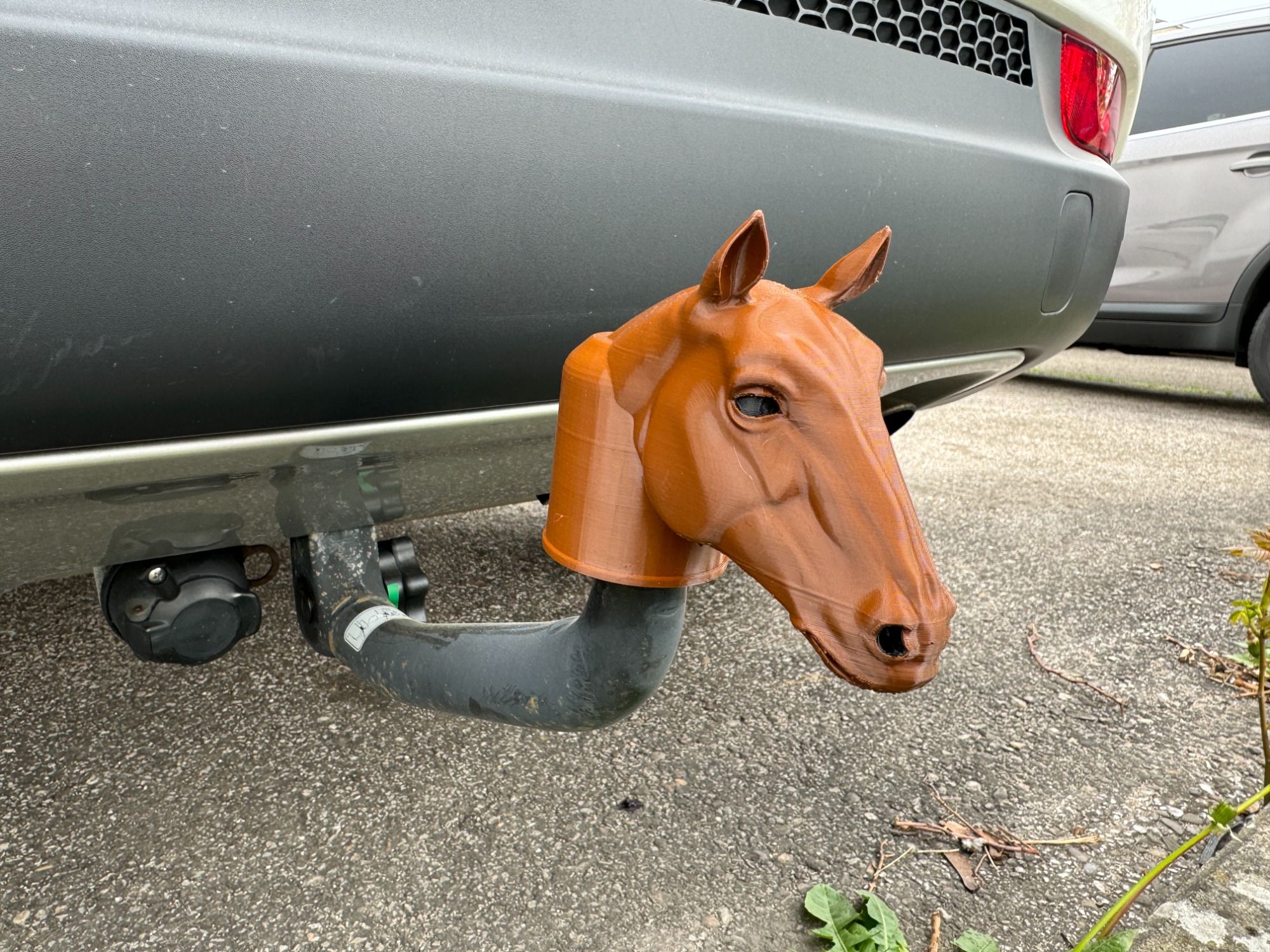 Eine Schutzkappe in Form eines Pferdekopfes für den Kugelkopf der Anhängerkupplung.
